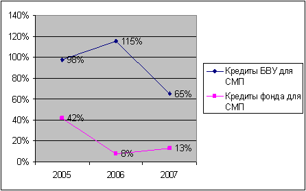 Рис. 3. Динамика прироста объемов кредитования БВУ и Фонда для СМП, 2005-2007 гг.
