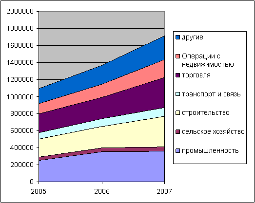 Наибольшая доля кредитования сферы торговли и строительства заметно отразилась на увеличении объема выпуска продукции строительства в 2007 году на 43% по сравнению с предыдущим периодом, и торговли на 41% (см. рис 4). Рост объемов кредитования торговли по отношению к другим сферам экономики сказывается на снижении диверсификации и развитии экономики в целом. Доля кредитования сельского хозяйства снизилась в 2007 году на 2%, что отразилось на объемах продукции сельского хозяйства в 2007 году. Объем продукции сельского хозяйства и промышленности в 2007 году по сравнению с предыдущим годом практически остался на прежнем уровне. Сельское хозяйство является одним из приоритетных направлений развития и стабильности Казахстана. В целом, с начала 2008 года за счет бюджета и институтов развития для сельского хозяйства было выделено свыше 127 млрд. тенге.