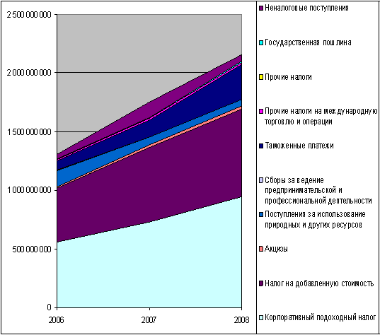 С учетом того, что банки сократили кредитование, масштабная государственная поддержка – и финансовая, и институциональная – была оказана малому и среднему бизнесу. Правительством в последнее время предпринимаются меры по решению проблемы кредитования, а также стабилизации ситуации в целом и на отдельных рынках экономики. Правительство Казахстана выделяет 160 млрд. тенге на поддержку малого и среднего бизнеса. За счет выделенных в конце прошлого года 48,8 млрд. тенге профинансировано свыше 2000 проектов субъектов малого и среднего бизнеса. Одним из направлений финансирования малого и среднего бизнеса является софинансирование республиканского и местных бюджетов. По 2 млрд. тенге будет выделено из областных бюджетов и еще по 2 млрд. тенге на каждую область - из республиканского бюджета. Таким образом, дополнительно 56 млрд. на кредитование малого и среднего бизнеса будет направлено в регионы. Также будет выделено 4 млрд. тенге на социально-предпринимательские корпорации специально для поддержки субъектов малого и среднего бизнеса. В этом году, из средств местных и республиканского бюджетов на малый бизнес также выделено 95,5 млрд. тенге. 50 млрд. тенге из этой суммы выделяется через Фонд «Қазына», и банки выделят еще 50 млрд. тенге. Деньги будут распределяться на кредитование субъектов малого и среднего бизнеса, расположенных в Алматы и Астане. При этом общая ставка кредитования составит порядка 12,5% против текущих 22%". Формирование условий для развития субъектов малого бизнеса связаны, прежде всего, с формированием условий оптимального налогообложения малого и среднего бизнеса. Существующая структура налоговых преференций обеспечивает стимулирующую роль развития малого бизнеса, но не является стимулятором роста прибыли через сокращения издержек производства. В основном, сфера предпринимательства развивается путем увеличения стоимости товаров и услуг, преимущественно тех, что ввозится и комплектуется, но не производится в республике. Сохранены в прежнем виде специальные налоговые режимы для малого бизнеса на основе патента и упрощенной декларации. Предусматривается целый ряд инициатив по сокращению налоговой отчетности. Максимальное снижение общей налоговой нагрузки для несырьевых секторов экономики за счет повышения экономической отдачи от добывающего сектора, существенно упрощает налоговое администрирование и оптимизирует сложившуюся систему налоговых льгот. Учитывая рост экономики, доходы от налогообложения в Казахстане существенно выросли, однако кризис ликвидности отразился на темпах роста доходности республиканского бюджета. Общее количество доходов республиканского бюджета на 2008 год составило 2 722 210 млн. тенге, из которых 2 103 413 млн. тенге от налоговых поступлений. Общее количество доходов в 2006 году от налоговых поступлений составляло 1 266 685млн. тенге (см. рис. 5).