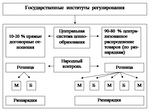 Экономика строилась по законам прямого распределения, регулирования, без эффективных обратных связей по всей совокупности параметров народного хозяйства.