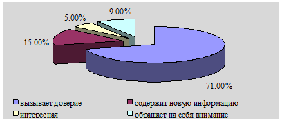 Важно отметить, что "интересной" рекламу посчитали лишь 5%, респондентов, также лишь небольшое количество (9%) опрашиваемых указало, что реклама обращает на себя внимание, следовательно, степень яркости и художественной привлекательности рекламы едва ли можно оценить как "хорошую". В то же время в содержательном плане реклама заинтересовывает в достаточно высокой степени (71%), что в свою очередь вызывает и укрепляет желание воспользоваться рекламируемым товаром.