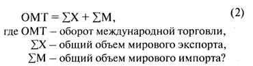 Так поступать было бы неверно. Дело в том, что в рамках всемирного хозяйства экспорт одних стран одновременно является импортом других. Это означает, что, воспользовавшись формулой (2), мы неизбежно столкнемся с ситуацией так называемого повторного счета. Для того чтобы его избежать, необходимо суммировать по всем странам лишь один из видов внешнеторговых операций — либо экспорт, либо импорт. Получаем следующую формулу: