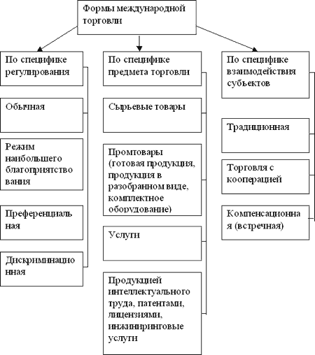 Формы международной торговли можно систематизировать по трем направлениям. Критериями определения форм является регулирование, предмет торговли, взаимодействие субъектов международной торговли.