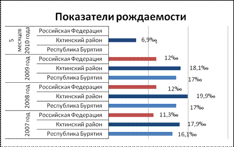 В республике Бурятия число родившихся составило в 2008 году 15,355, общий коэффициент рождаемости составил 16,0 на 1000 человек населения, в 2009-16 819 тыс., коэффициент рождаемости 17,5 на 1000 человек населения, за период январь- февраль 2010 года родилось 2526 тыс. детей. По Кяхтинскому району в 2007 году данный показатель составил 17,9, в 2008 году-19,9, в 2009 году-18,1, за 5 месяцев 2010 года-6,9