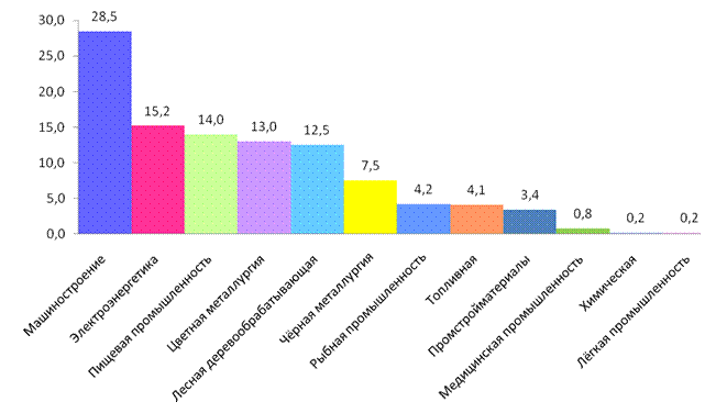 Рис. 1 Отраслевая структура промышленного производства в процентах к общему объему производства 2010 г. (в %)