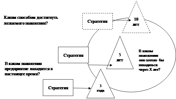 Стратегическое управление в каждый данный момент фиксирует, что организация должна делать в настоящем, чтобы достичь поставленных целей в будущем, исходя при этом из того, что окружение будет изменяться, и условия жизни организации будут изменяться тоже. Таким образом, если внутрифирменное управление ориентировано на создание оптимальных управленческих условий, обеспечивающих реализацию запланированных целей, то стратегическое управление ориентировано на создание соответствующих условий конкурентоспособности и развития фирмы в зависимости от изменений внешней рыночной среды.