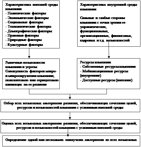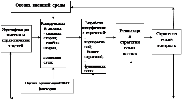 Стратегический менеджмент – это процесс принятия и осуществления стратегических решений, центральным звеном которого является стратегический выбор, основанный на сопоставлении собственного ресурсного потенциала предприятия с возможностями и угрозами внешнего окружения, в котором оно действует.