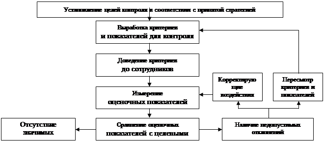 Процесс контроля начинается с установления целей или стандартов контроля. Затем следует стадия выработки критериев, оценочных показателей, которые доводятся до сотрудников и организуется процесс измерения оценочных показателей. После сравнения оценочных показателей с целевым в случае выявленных отклонений проводятся корректирующие воздействия, а если необходимо, то и пересмотр критериев. В любом случае цикл контроля затем повторяется вновь (рисунок 7).