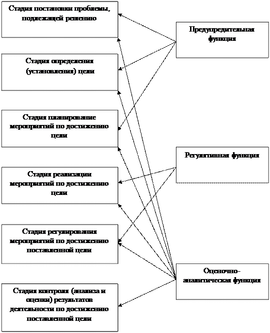 Предупредительная функция. Как отмечалось, контроль присутствует на всех стадиях процесса управления. Предупредительная функция проявляется на стадиях: постановки проблемы, подлежащей решению; принятия, решения о цели, подлежащей достижению; планирования мероприятий по достижению цели. На указанных стадиях контроль позволяет предупредить нарушения действующего законодательства, выявить еще на стадии прогнозов и планов дополнительные финансовые резервы, пресечь попытки нерационального использования средств.