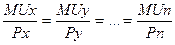 Как видно, функция полезности возрастает при условии – «одинаковая предельная полезность на каждую последующую единицу дополнительных денежных затрат». Но соотношение предельной полезности любых товаров должно быть равно соотношению их цен. В этом случае рациональный потребитель уравновесит предельную полезность любого товара с предельными денежными затратами собственного бюджета, руководствуясь правилом, которое можно выразить алгебраически следующим образом: