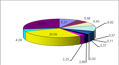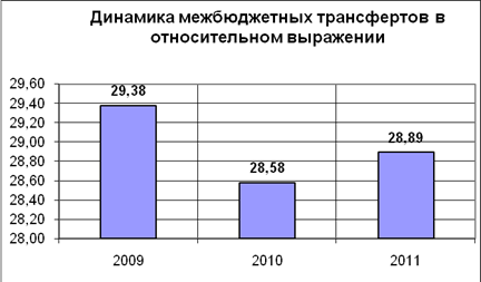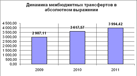 Наибольший удельный вес в классификации расходов занимают межбюджетные трансферты. В 2009 году доля расходования этих средств составляет 29,38%. Если говорить о динамике этого показателя, то уже в следующем году (2010) он снижается на 0,8%. Но в денежном эквиваленте увеличивается на 630,46 млрд. руб. В среднесрочной перспективе предусмотрено абсолютное увеличение межбюджетных трансфертов к 2011 году до 3 994,42 млрд. рублей, что составляет на 1 007,31 млрд. руб. больше по отношению к 2009 году. В диаграмме 1 и 2, можно наглядно увидеть, как происходит изменение этого показателя.