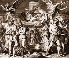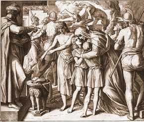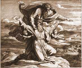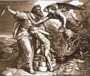 И было, после сих происшествий Бог искушал Авраама и сказал ему: Авраам! Он сказал: вот я. Бог сказал: возьми сына твоего, единственного твоего, которого ты любишь, Исаака: и пойди в землю Мориа и там принеси его во всесожжение на одной из гор, о которой Я скажу тебе. Авраам встал рано утром, оседлал осла своего, взял с собою двоих из отроков своих и Исаака, сына своего; наколол дров для всесожжения, и встав пошёл на место, о котором сказал ему Бог. На третий день Авраам возвёл очи свои и увидел то место издалека. И сказал Авраам отрокам своим: останьтесь вы здесь с ослом, а я и сын пойдём туда и поклонимся, и возвратимся к вам. И взял Авраам дрова для всесожжения, и возложил на Исаака, сына своего: взял в руки огонь и нож, и пошли оба вместе. И начал Исаак говорить Аврааму, отцу своему, и сказал: отец стой! Он отвечал: вот я, сын мой. Он сказал: вот огонь и дрова, где же агнец для всесожжения? Авраам сказал: Бог усмотрит Себе агнца для всесожжения, сын мой. И шли далее оба вместе. И пришли на место, о котором сказал ему Бог; и устроил там Авраам жертвенник, разложил дрова и, связав сына своего Исаака, положил его на жертвенник поверх дров. И простёр Авраам руку свою и взял нож, чтобы заколоть сына своего. Но Ангел Господень воззвал к нему с неба и сказал: Авраам! Авраам! Он сказал: вот я. Ангел сказал: не поднимай руки твоей на отрока и не делай над ним ничего, ибо теперь Я знаю, что боишься ты Бога и не пожалел сына твоего, единственного твоего, для Меня. И возвёл Авраам очи свои и увидел: и вот, позади овен, запутавшийся в чаще рогами своими. Авраам пошёл, взял овна и принёс его во всесожжение вместо [Исаака], сына своего.