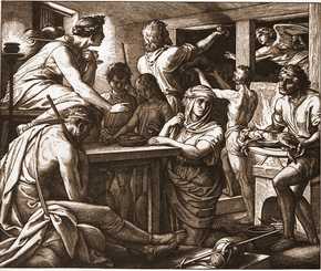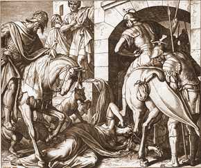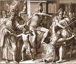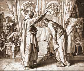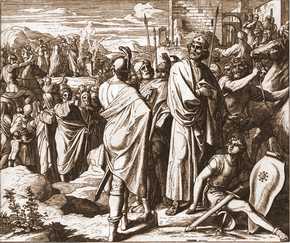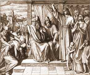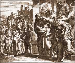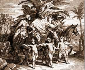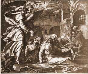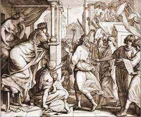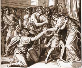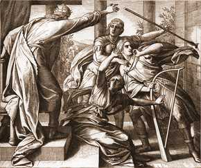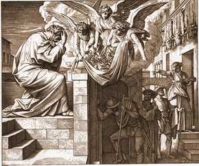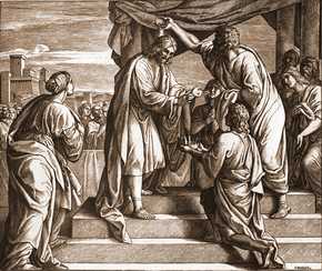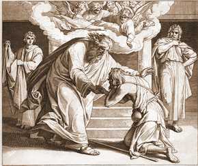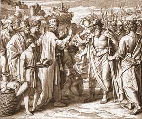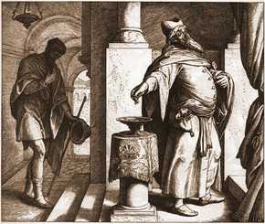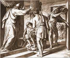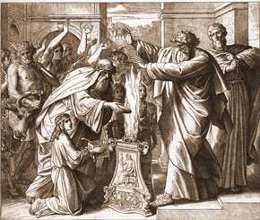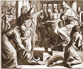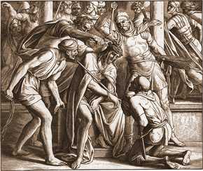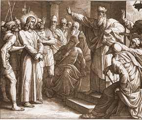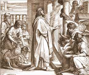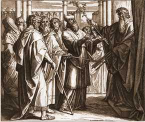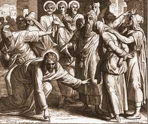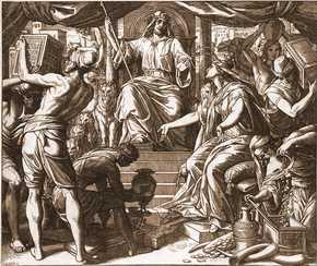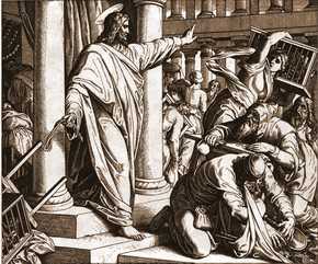 Приближалась Пасха Иудейская, и Иисус пришёл в Иерусалим и нашёл, что в храме продавали волов, овец и голубей, и сидели меновщики денег. И, сделав бич из веревок, выгнал из храма всех, также и овец и волов; и деньги у меновщиков рассыпал, а столы их опрокинул. И сказал продающим голубей: возьмите это отсюда и дома Отца Моего не делайте домом торговли. При сем ученики Его вспомнили, что написано: ревность по доме Твоем снедает Меня.