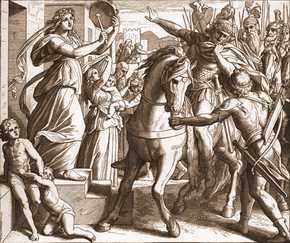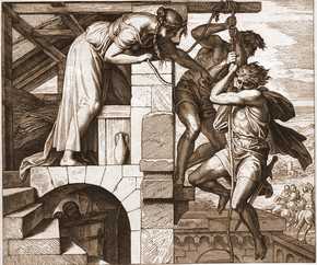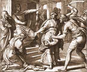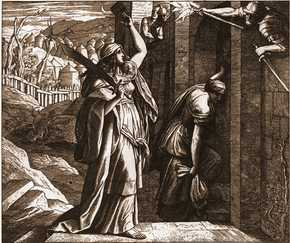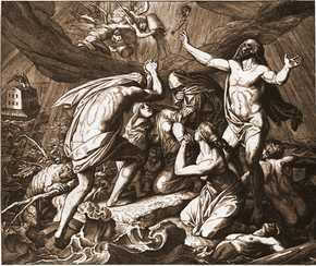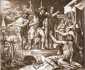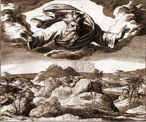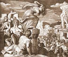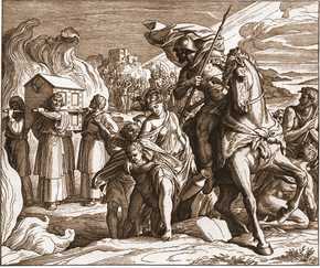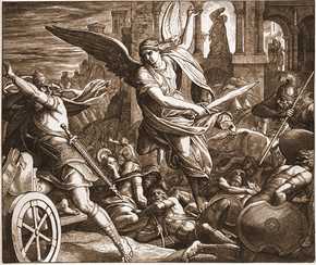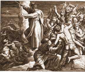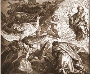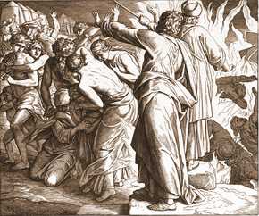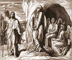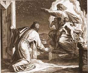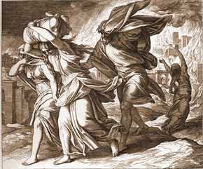 Когда взошла заря, Ангелы начали торопить Лота, говоря: встань, возьми жену твою и двух дочерей твоих, которые у тебя, чтобы не погибнуть тебе за беззакония города. И как он медлил, то мужи те [Ангелы], по милости к нему Господней, взяли за руку его и жену его, и двух дочерей его, и вывели его и поставили его вне города. Когда же вывели их вон, то один из них сказал: спасай душу свою: не оглядывайся назад и нигде не останавливайся в окрестности сей; спасайся на гору, чтобы тебе не погибнуть. И пролил Господь на Содом и Гоморру дождём серу и огонь от Господа с неба, и ниспроверг города сии, и всю окрестность сию, и всех жителей городов сих, и [все] произрастания земли. Жена же Логова оглянулась позади его, и стала соляным столпом.