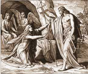 Сказав сие, обратилась назад и увидела Иисуса стоящего; но не узнала, что это Иисус. Иисус говорит ей: жена! что ты плачешь? кого ищешь? Она, думая, что это садовник, говорит Ему: господин! если ты вынес Его, скажи мне, где ты положил Его, и я возьму Его. Иисус говорит ей: Мария! Она, обратившись, говорит Ему: Раввуни! – что значит: Учитель! Иисус говорит ей: не прикасайся ко Мне, ибо Я ещё не восшёл к Отцу Моему; а иди к братьям Моим и скажи им: восхожу к Отцу Моему и Отцу вашему, и к Богу Моему и Богу вашему.