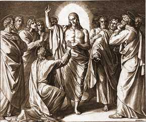 Фома же, один из двенадцати, называемый Близнец, не был тут с ними, когда приходил Иисус. Другие ученики сказали ему: мы видели Господа. Но он сказал им: если не увижу на руках Его ран от гвоздей, и не вложу перста моего в раны от гвоздей, и не вложу руки моей в ребра Его, не поверю. После восьми дней опять были в доме ученики Его, и Фома с ними. Пришёл Иисус, когда двери были заперты, стал посреди них и скачал: мир вам! Потом говорит Фоме: подай перст твой сюда и посмотри руки Мои; подай руку твою и вложи в ребра Мои; и не будь неверующим, но верующим. Фома сказал Ему в ответ: Господь мой и Бог мой! Иисус говорит ему: ты поверил, потому что увидел Меня; блаженны не видевшие и уверовавшие. Много сотворил Иисус пред учениками Своими и других чудес, о которых не писано в книге сей. Сие же написано, дабы вы уверовали, что Иисус есть Христос, Сын Божий, и, веруя, имели жизнь во имя Его.