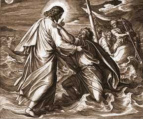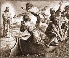 После того опять явился Иисус ученикам Своим при море Тивериадском. Явился же так: были вместе Симон Пётр, и Фома, называемый Близнец, и Нафанаил из Каны Галилейской, и сыновья Зеведеевы, и двое других из учеников Его. Симон Пётр говорит им: иду ловить рыбу. Говорят ему: идём и мы с тобою. Пошли и тотчас вошли в лодку, и не поймали в ту ночь ничего. А когда уже настало утро, Иисус стоял на берегу; но ученики не узнали, что это Иисус. Иисус говорит им: дети! есть ли у вас какая пища? Они отвечали Ему: нет. Он же сказал им: закиньте сеть по правую сторону лодки, и поймаете. Они закинули, и уже не могли вытащить сети от множества рыбы. Тогда ученик, которого любил Иисус, говорит Петру: это Господь. Симон же Пётр, услышав, что это Господь, опоясался одеждою, – ибо он был наг, – и бросился в море.