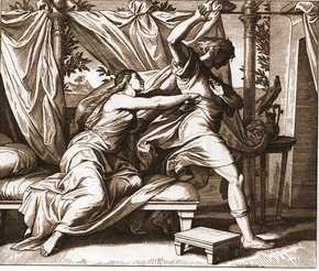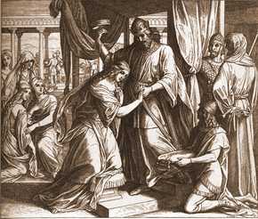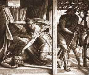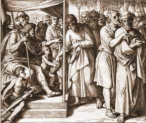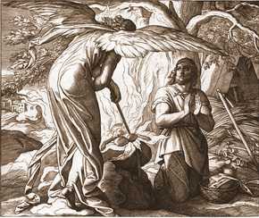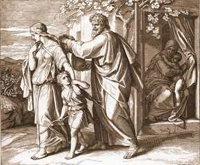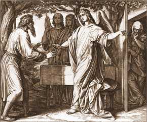 И явился ему Господь у дубравы Мамре, когда он сидел при входе в шатёр [свой], во время зноя дневного. Он возвёл очи свои и взглянул, и вот, три мужа стоят против него. Увидев, он побежал навстречу им от входа в шатёр [свой] и поклонился до земли, и сказал: Владыка! если я обрел благоволение пред очами Твоими, не пройди мимо раба Твоего; и принесут немного воды, и омоют ноги ваши; и отдохните под сим деревом, а я принесу хлеба, и вы подкрепите сердца ваши; потом пойдите [в путь свой]; так как вы идёте мимо раба вашего. Они сказали: сделай так, как говоришь. И поспешил Авраам в шатёр к Сарре и сказал [ей]: поскорее замеси три саты лучшей муки и сделай пресные хлебы. И побежал Авраам к стаду, и взял телёнка нежного и хорошего, и дал отроку, и тот поспешил приготовить его. И взял масла и молока и телёнка приготовленного, и поставил перед ними. а сам стоял подле них под деревом. И они ели. И сказали ему: где Сарра, жена твоя? Он отвечал: здесь, в шатре. И сказал один из них: Я опять буду у тебя в это же время [в следующем году], и будет сын у Сарры, жены твоей. А Сарра слушала у входа в шатер, сзади его.
