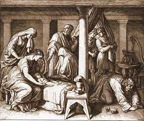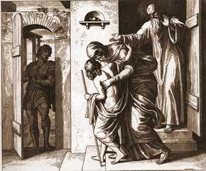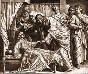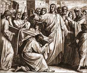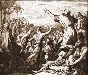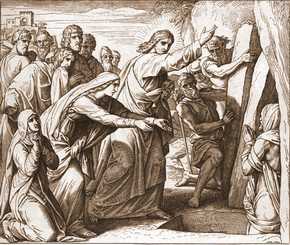 После сего Иисус пошёл в город, называемый Наин; и с Ним шли многие из учеников Его и множество народа. Когда же Он приблизился к городским воротам, тут выносили умершего, единственного сына у матери, а она была вдова; и много народа шло с нею из города. Увидев ее, Господь сжалился над нею и сказал ей: не плачь. И, подойдя, прикоснулся к одру; несшие остановились, и Он сказал: юноша! тебе говорю, встань! Мёртвый, поднявшись, сел и стал говорить; и отдал его Иисус матери его. И всех объял страх, и славили Бога, говоря: великий пророк восстал между нами, и Бог посетил народ Свой. Такое мнение о Нем распространилось по всей Иудее и по всей окрестности.