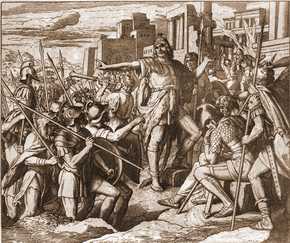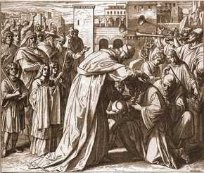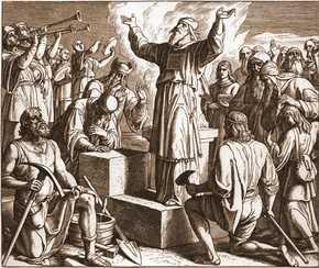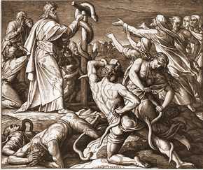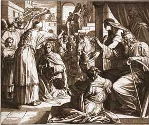 В Листре некоторый муж, не владевший ногами, сидел, будучи хром от чрева матери своей, и никогда не ходил. Он слушал говорившего Павла, который, взглянув на него и увидев, что он имеет веру для получения исцеления, сказал громким голосом: тебе говорю во имя Господа Иисуса Христа: стань на ноги твои прямо. И он тотчас вскочил и стал ходить. Народ же, увидев, что сделал Павел, возвысил свой голос, говоря по‑ликаонски: боги в образе человеческом сошли к нам. И называли Варнаву Зевсом, а Павла Ермием, потому что он начальствовал в слове. Жрец же идола Зевса, находившегося перед их городом, приведя к воротам волов и принеся венки, хотел вместе с народом совершить жертвоприношение. Но Апостолы Варнава и Павел, услышав о сём, разодрали свои одежды и, бросившись в народ, громогласно говорили: мужи! что вы это делаете? И мы – подобные вам человеки, и благовествуем вам, чтобы вы обратились от сих ложных к Богу Живому, Который сотворил небо и землю, и море, и всё, что в них, Который в прошедших родах попустил всем народам ходить своими путями, хотя и не переставал свидетельствовать о Себе благодеяниями, подавая нам с неба дожди и времена плодоносные и исполняя пищею и веселием сердца наши. И, говоря сие, они едва убедили народ не приносить им жертвы и идти каждому домой.