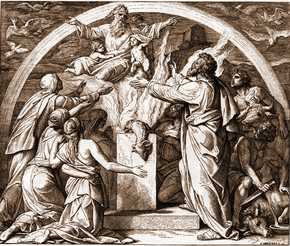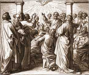 При наступлении дня Пятидесятницы все они были единодушно вместе. И внезапно сделался шум с неба, как бы от несущегося сильного ветра, и наполнил весь дом, где они находились. И явились им разделяющиеся языки, как бы огненные, и почили по одному на каждом из них. И исполнились все Духа Святого, и начали говорить на иных языках, как Дух давал им провещевать.