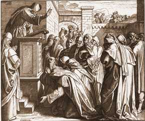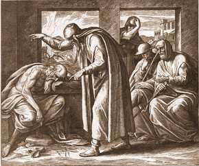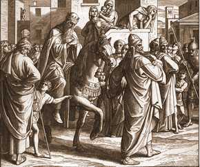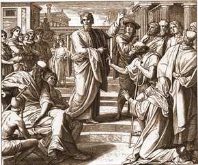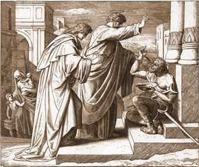 Петр и Иоанн шли вместе в храм в час молитвы девятый. И был человек, хромой от чрева матери его, которого носили и сажали каждый день при дверях храма, называемых Красными, просить милостыни у входящих в храм. Он, увидев Петра и Иоанна перед входом в храм, просил у них милостыни. Пётр с Иоанном, всмотревшись в него, сказали: взгляни на нас, И он пристально смотрел на них, надеясь получить от них что‑нибудь. Но Пётр сказал: серебра и золота нет у меня; а что имею, то даю тебе: во имя Иисуса Христа Назорея встань и ходи. И, взяв его за правую руку, поднял; и вдруг укрепились его ступни и колени, и вскочив, стал, и начал ходить, и вошел с ними в храм, ходя и скача, и хваля Бога.