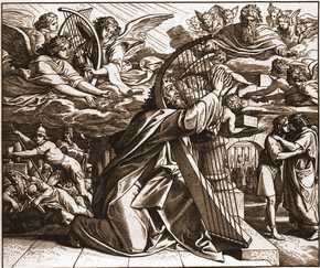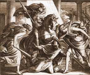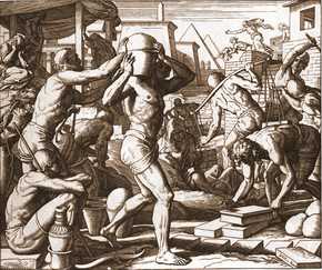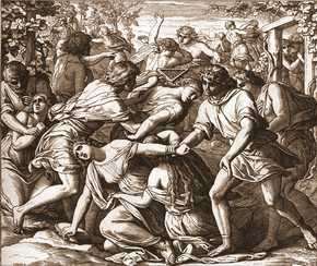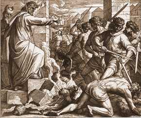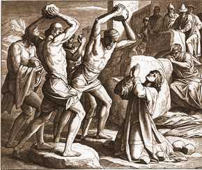 Стефан же, будучи исполнен Духа Святаго, воззрев на небо, увидел славу Божию и Иисуса, стоящего одесную Бога, и сказал: вот, я вижу небеса отверстые и Сына Человеческого, стоящего одесную Бога. Но они, закричав громким голосом, затыкали уши свои, и единодушно устремились на него, и, выведя за город, стали побивать его камнями. Свидетели же положили свои одежды у ног юноши, именем Савла, и побивали камнями Стефана, который молился и говорил: Господи Иисусе! прими дух мой. И, преклонив колени, воскликнул громким голосом: Господи! не вмени им греха сего. И, сказав сие, почил.
