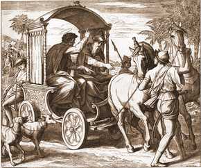 А Филиппу Ангел Господень сказал: встань и иди на полдень, на дорогу, идущую из Иерусалима в Газу, на ту, которая пуста. Он встал и пошёл. И вот, муж ефиоплянин, евнух, вельможа Кандакии, царицы Ефиопской. хранитель всех сокровищ её, приезжавший в Иерусалим для поклонения, возвращался и, сидя на колеснице своей, читал пророка Исаию. Дух сказал Филиппу: подойди и пристань к сей колеснице. Филипп подошёл и, услышав, что он читает пророка Исаию, сказал: разумеешь ли, что читаешь? Он сказал: как могу разуметь, если кто не наставит меня? и попросил Филиппа взойти и сесть с ним. А место из Писания, которое он читал, было сие: как овца, ведён был Он на заклание, и как агнец пред стригущим его безгласен, так Он не отверзает уст Своих. В уничижении Его суд Его совершился. Но род Его кто разъяснит? ибо вземлется от земли жизнь Его. Евнух же сказал Филиппу: прошу тебя сказать, о ком пророк говорит это? о себе ли или о ком другом? Филипп отверз уста свои и, начав от сего Писания, благовествовал ему об Иисусе. Между тем, продолжая путь, они приехали к воде; и евнух сказал: вот вода; что препятствует мне креститься? Филипп же сказал ему: если веруешь от всего сердца, можно. Он сказал в ответ: верую, что Иисус Христос есть Сын Божий. И приказал остановить колесницу, и сошли оба в воду, Филипп и евнух; и крестил его. Когда же они вышли из воды. Дух Святой сошёл на евнуха, а Филиппа восхитил Ангел Господень, и евнух уже не видел его, и продолжал путь, радуясь.