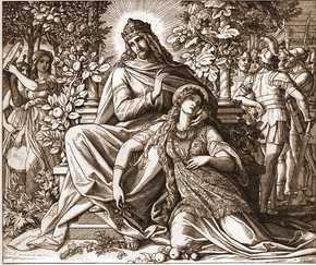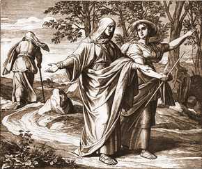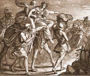 И встала Ревекка и служанки её, и сели на верблюдов, и поехали за тем человеком. И раб взял Ревекку и пошёл. А Исаак пришёл из Беэр‑лахай‑рои, ибо жил он в земле полуденной. При наступлении вечера Исаак вышел в поле поразмыслить, и возвёл очи свои, и увидел: вот, идут верблюды. Ревекка взглянула, и увидела Исаака, и спустилась с верблюда. И сказала рабу: кто этот человек, который идёт по полю навстречу нам? Раб сказал: это господин мой. И она взяла покрывало и покрылась. Раб же сказал Исааку всё, что сделал. И ввёл её Исаак в шатер Сарры, матери своей, и взял Ревекку, и она сделалась ему женою, и он возлюбил ее.