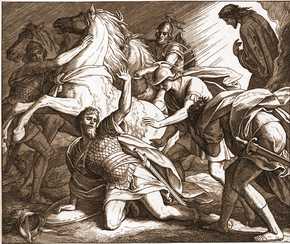 Савл же, ещё дыша угрозами и убийством на учеников Господа, пришёл к первосвященнику и выпросил у него письма в Дамаск к синагогам, чтобы, кого найдёт последующих сему учению, и мужчин и женщин, связав, приводить в Иерусалим. Когда же он шёл и приближался к Дамаску, внезапно осиял его свет с неба. Он упал на землю и услышал голос, говорящий ему: Савл, Савл! что ты гонишь Меня? Он сказал: кто Ты, Господи? Господь же сказал: Я Иисус, Которого ты гонишь. Трудно тебе идти против рожна. Он в трепете и ужасе сказал: Господи! что повелишь мне делать? И Господь сказал ему: встань и иди в город; и сказано будет тебе, что тебе надобно делать. Люди же, шедшие с ним, стояли в оцепенении, слыша голос, а никого не видя. Савл встал с земли и с открытыми глазами никого не видел. И повели его за руки, и привели в Дамаск. И три дня он не видел, и не ел, и не пил.