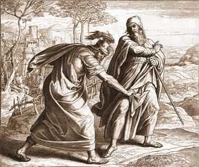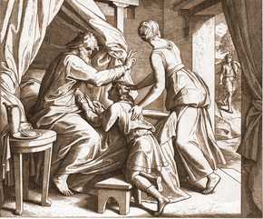 И сказал Исаак Иакову: подойди [ко мне], я ощупаю тебя, сын мой, ты ли сын мой Исав или нет? Иаков подошёл к Исааку, отцу своему, и он ощупал его и сказал: голос, голос Иакова; а руки, руки Исавовы. И не узнал его, потому что руки его были, как руки Исава, брата его, косматые; и благословил его и сказал: ты ли сын мой Исав? Он отвечал: я. Исаак сказал: подай мне, я поем дичи сына моего, чтобы благословила тебя душа моя. Иаков подал ему, и он ел; принёс ему и вина, и он пил. Исаак, отец его, сказал ему подойди [ко мне], поцелуй меня, сын мой. Он подошёл и поцеловал его. И ощутил Исаак запах от одежды его и благословил его и сказал; вот, запах от сына моего, как запах от поля [полного], которое благословил Господь; да даст тебе Бог от росы небесной и от тука земли, и множество хлеба и вина; да послужат тебе народы, и да поклонятся тебе племена; будь господином над братьями твоими, и да поклонятся тебе сыны матери твоей; проклинающие тебя – прокляты; благословляющие тебя – благословенны! Как скоро совершил Исаак благословение над Иаковом [сыном своим], и как только вышел Иаков от лица Исаака, отца своего, Исав, брат его, пришёл с ловли