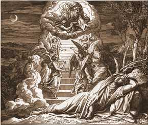 Иаков же вышел из Вирсавии и пошёл в Харран, и пришёл на одно место, и остался там ночевать, потому что зашло солнце. И взял один из камней того места, и положил себе изголовьем, и лёг на том месте. И увидел во сне: вот, лестница стоит на земле, а верх её касается неба; и вот, Ангелы Божии восходят и нисходят по ней. И вот, Господь стоит на ней и говорит: Я Господь, Бог Авраама, отца твоего, и Бог Исаака; [не бойся]. Землю, на которой ты лежишь, Я дам тебе и потомству твоему; и будет потомство твоё, как песок земной; и распространишься к морю и к востоку, и к северу и к полудню; и благословятся в тебе и в семени твоём все племена земные; и вот Я с тобою, и сохраню тебя везде, куда ты ни пойдёшь; и возвращу тебя в сию землю, ибо Я не оставлю тебя, доколе не исполню того, что Я сказал тебе. Иаков пробудился от сна своего и сказал: истинно Господь присутствует на месте сем; а я не знал! И убоялся и сказал: как страшно сие место! это не иное что, как дом Божий, это врата небесные.