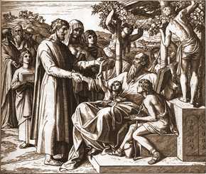 На другой день Иисус восхотел идти в Галилею, и находит Филиппа и говорит ему: иди за Мною. Филипп же был из Вифсаиды, из одного города с Андреем и Петром. Филипп находит Нафанаила и говорит ему: мы нашли Того, о Котором писали Моисей в законе и пророки, Иисуса, сына Иосифова, из Назарета. Но Нафанаил сказал ему: из Назарета может ли быть что доброе? Филипп говорит ему: пойди и посмотри. Иисус, увидев идущего к Нему Нафанаила, говорит о нём: вот подлинно израильтянин, в котором нет лукавства. Нафанаил говорит Ему: почему Ты знаешь меня? Иисус сказал ему в ответ: прежде нежели позвал тебя Филипп, когда ты был под смоковницею, Я видел тебя. Нафанаил отвечал Ему: Равви! Ты Сын Божий, Ты Царь Израилев. Иисус сказал ему в ответ: ты веришь, потому что Я тебе сказал: Я видел тебя под смоковницею; увидишь больше сего. И говорит ему: истинно, истинно говорю вам: отныне будете видеть небо отверстым и Ангелов Божиих восходящих и нисходящих к Сыну Человеческому.
