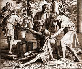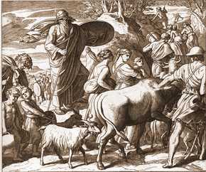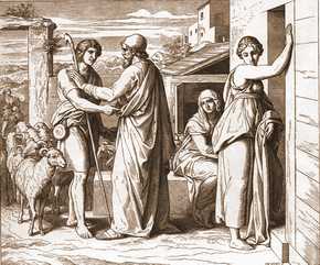 И встал Иаков и пошёл в землю сынов востока [к Лавану, сыну Вафуила Арамеянина, к брату Ревекки, матери Иакова и Исава]. И увидел: вот, на поле колодезь, и там три стада мелкого скота, лежавшие около него, потому что из того колодезя поили стада. Над устьем колодезя был большой камень. Когда собирались туда все стада, отваливали камень от устья колодезя и поили овец; потом опять клали камень на своё место, на устье колодезя. Иаков сказал им [пастухам]: братья мои! откуда вы? Они сказали: мы из Харрана. Он сказал им: знаете ли вы Лавана, сына Нахорова? Они сказали: знаем. Он ещё сказал им: здравствует ли он? Они сказали: здравствует; и вот, Рахиль, дочь его, идёт с овцами. И сказал [Иаков]: вот, дня ещё много; не время собирать скот; напойте овец и пойдите, пасите. Они сказали: не можем, пока не соберутся все стада, и не отвалят камня от устья колодезя; тогда будем мы поить овец. Ещё он говорил с ними, как пришла Рахиль [дочь Лавана] с мелким скотом отца своего, потому что она пасла [мелкий скот отца своего]. Когда Иаков увидел Рахиль, дочь Лавана, брата матери своей, и овец Лавана, брата матери своей, то подошёл Иаков, отвалил камень от устья колодезя и напоил овец Лавана, брата матери своей. И поцеловал Иаков Рахиль и возвысил голос свой и заплакал. И сказал Иаков Рахили, что он родственник отцу её и что он сын Ревеккин.