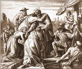 Тогда немалый плач был у всех, и, падая на выю Павла, целовали его, скорбя особенно от сказанного им слова, что они уже не увидят лица его. И провожали его до корабля.