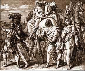И встал Иаков, и посадил детей своих и жён своих на верблюдов, и взял с собою весь скот свой и всё богатство своё, которое приобрёл, скот собственный его. который он приобрёл в Месопотамии, [и всё своё,] чтобы идти к Исааку, отцу своему, в землю Ханаанскую.