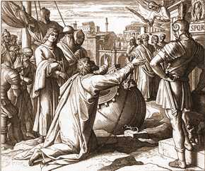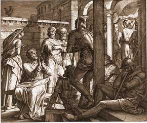 С этого времени Пилат искал отпустить Его. Иудеи же кричали: если отпустишь Его, ты не друг кесарю; всякий, делающий себя царём, противник кесарю. Пилат, услышав это слово, вывел вон Иисуса и сел на судилище, на месте, называемом Лифостротон, а по‑еврейски Гаввафа. Тогда была пятница перед Пасхою, и час шестой. И сказал Пилат иудеям: се, Царь ваш! Но они закричали: возьми, возьми, распни Его! Пилат говорит им: Царя ли вашего распну? Первосвященники отвечали: нет у нас царя, кроме кесаря. Тогда наконец он предал Его им на распятие.