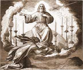Я, Иоанн, брат ваш и соучастник в скорби и в царствии и в терпении Иисуса Христа, был на острове, называемом Патмос, за слово Божие и за свидетельство Иисуса Христа. Я был в духе в день воскресный, и слышал позади себя громкий голос, как бы трубный, который говорил: Я есмь Альфа и Омега, Первый и Последний; то, что видишь, напиши в книгу и пошли церквам, находящимся в Асии: в Ефес, и в Смирну, и в Пергам, и в Фиатиру, и в Сардис, и в Филадельфию, и в Лаодикию. Я обратился, чтобы увидеть, чей голос, говоривший со мною; и обратившись, увидел семь золотых светильников и, посреди семи светильников, подобного Сыну Человеческому, облечённого в подир и по персям опоясанного золотым поясом: глава Его и волосы белы, как белая волна, как снег; и очи Его – как пламень огненный; и ноги Его подобны халколивану, как раскалённые в печи, и голос Его – как шум вод многих. Он держал в деснице Своей семь звёзд, и из уст Его выходил острый с обеих сторон меч; и лицо Его – как солнце, сияющее в силе своей. И когда я увидел Его, то пал к ногам Его, как мёртвый. И Он положил на меня десницу Свою и сказал мне: не бойся; Я есмь Первый и Последний, и живый; и был мёртв, и се, жив во веки веков, аминь; и имею ключи ада и смерти.