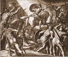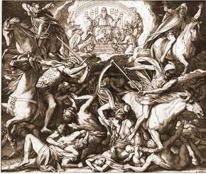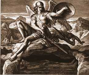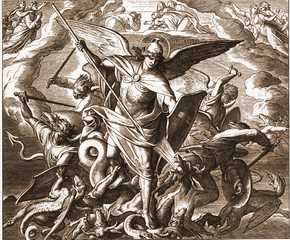 И произошла на небе война: Михаил и Ангелы его воевали против дракона, и дракон и ангелы его воевали против них, но не устояли, и не нашлось уже для них места на небе. И низвержен был великий дракон, древний змий, называемый диаволом и сатаною, обольщающий всю вселенную, низвержен на землю, и ангелы его низвержены с ним. И услышал я громкий голос, говорящий на небе: ныне настало спасение и сила и царство Бога нашего и власть Христа Его, потому что низвержен клеветник братий наших, клеветавший на них пред Богом нашим день и ночь. Они победили его кровию Агнца и словом свидетельства своего, и не возлюбили души своей даже до смерти. Итак, веселитесь, небеса и обитающие на них!