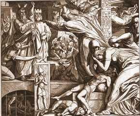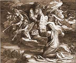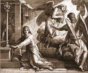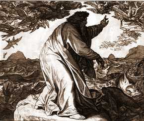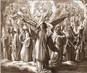 И когда Он снял седьмую печать, сделалось безмолвие на небе, как бы на полчаса. И я видел семь Ангелов, которые стояли пред Богом; и дано им семь труб. И пришёл иной Ангел, и стал перед жертвенником, держа золотую кадильницу; и дано было ему множество фимиама, чтобы он с молитвами всех святых возложил его на золотой жертвенник, который перед престолом. И вознёсся дым фимиама с молитвами святых от руки Ангела пред Бога. И взял Ангел кадильницу, и наполнил ее огнём с жертвенника, и поверг на землю: и произошли голоса и громы, и молнии и землетрясение. И семь Ангелов, имеющие семь труб, приготовились трубить. Первый Ангел вострубил, и сделались град и огонь, смешанные с кровью, и пали на землю; и третья часть дерев сгорела, и вся трава зелёная сгорела. Второй Ангел вострубил, и как бы большая гора, пылающая огнём, низверглась в море; и третья часть моря сделалась кровью.