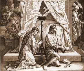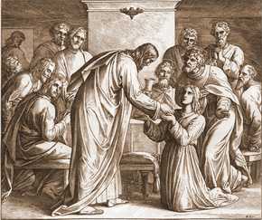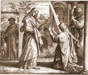В продолжение пути их пришёл Он в одно селение; здесь женщина, именем Марфа, приняла Его в дом свой; у неё была сестра, именем Мария, которая села у ног Иисуса и слушала слово Его. Марфа же заботилась о большом угощении и, подойдя, сказала: Господи! или Тебе нужды нет, что сестра моя одну меня оставила служить? скажи ей, чтобы помогла мне. Иисус же сказал ей в ответ: Марфа! Марфа! ты заботишься и суетишься о многом, а одно только нужно; Мария же избрала благую часть, которая не отнимется у неё.