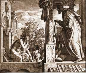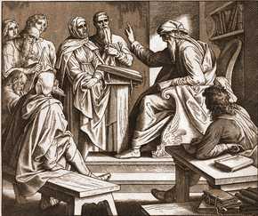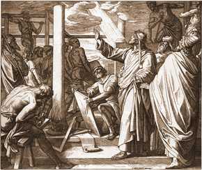 В ожидании их в Афинах Павел возмутился духом при виде этого города, полного идолов. Итак он рассуждал в синагоге с иудеями и с чтущими Бога, и ежедневно на площади со встречающимися. Некоторые из эпикурейских и стоических философов стали спорить с ним; и одни говорили: «что хочет сказать этот суеслов?», а другие: «кажется, он проповедует о чужих божествах», потому что он благовествовал им Иисуса и воскресение. И, взяв его, привели в ареопаг и говорили: можем ли мы знать, что это за новое учение, проповедуемое тобою? Ибо что‑то странное ты влагаешь в уши наши. Посему хотим знать, что это такое? Афиняне же все и живущие у них иностранцы ни в чём охотнее не проводили время, как в том, чтобы говорить или слушать что‑нибудь новое. И, став Павел среди ареопага, сказал: Афиняне! по всему вижу я, что вы как бы особенно набожны. Ибо, проходя и осматривая ваши святыни, я нашёл и жертвенник, на котором написано «неведомому Богу». Сего‑то, Которого вы, не зная, чтите, я проповедую вам. Бог, сотворивший мир и всё, что в нём. Он, будучи Господом неба и земли, не в рукотворенных храмах живёт и не требует служения рук человеческих, как бы имеющий в чём‑либо нужду, Сам дая всему жизнь и дыхание и всё. От одной крови Он произвёл весь род человеческий для обитания по всему лицу земли, назначив предопределённые времена и пределы их обитанию, дабы они искали Бога, не ощутят ли Его и не найдут ли, хотя Он и недалеко от каждого из нас: ибо мы Им живём и движемся и существуем, как и некоторые из ваших стихотворцев говорили; «мы Его и род».