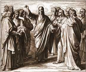 Иисус взошёл на гору и там сидел с учениками Своими. Приближалась же Пасха, праздник Иудейский. Иисус, возведя очи и увидев, что множество народа идёт к Нему, говорит Филиппу: где нам купить хлебов, чтобы их накормить? Говорил же это, испытывая его; ибо Сам знал, что хотел сделать. Филипп отвечал Ему: им на двести динариев не довольно будет хлеба, чтобы каждому из них досталось хотя понемногу. Один из учеников Его, Андрей, брат Симона Петра, говорит Ему: здесь есть у одного мальчика пять хлебов ячменных и две рыбки; но что это для такого множества? Иисус сказал: велите им возлечь. Было же на том месте много травы. Итак возлегло людей числом около пяти тысяч. Иисус, взяв хлебы и воздав благодарение, роздал ученикам, а ученики возлежавшим, также и рыбы, сколько кто хотел. И когда насытились, то сказал ученикам Своим: соберите оставшиеся куски, чтобы ничего не пропало. И собрали, и наполнили двенадцать коробов кусками от пяти ячменных хлебов, оставшимися у тех, которые ели. Тогда люди, видевшие чудо, сотворённое Иисусом, сказали: это истинно Тот Пророк, Которому должно прийти в мир.