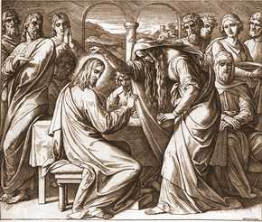 Некто из фарисеев просил Его вкусить с ним пищи; и Он, войдя в дом фарисея, возлёг. И вот, женщина того города, которая была грешница, узнав, что Он возлежит в доме фарисея, принесла алавастровый сосуд с миром и, став позади у ног Его и плача, начала обливать ноги Его слезами и отирать волосами головы своей, и целовала ноги Его, и мазала миром. Видя это, фарисей, пригласивший Его, сказал сам в себе: если бы Он был пророк, то знал бы, кто и какая женщина прикасается к Нему, ибо она грешница. Обратившись к нему, Иисус сказал: Симон! Я имею нечто сказать тебе. Он говорит: скажи, Учитель. Иисус сказал: у одного заимодавца было два должника: один должен был пятьсот динариев, а другой пятьдесят, но как они не имели чем заплатить, он простил обоим. Скажи же, который из них более возлюбит его? Симон отвечал: думаю, тот, которому более простил. Он сказал ему: правильно ты рассудил. И, обратившись к женщине, сказал Симону: видишь ли ты эту женщину? Я пришёл в дом твой, и ты воды Мне на ноги не дал, а она слезами облила Мне ноги и волосами головы своей отёрла; ты целования Мне не дал, а она, с тех пор как Я пришёл, не перестаёт целовать у Меня ноги; ты головы Мне маслом не помазал, а она миром помазала Мне ноги. А потому сказываю тебе: прощаются грехи её многие за то, что она возлюбила много, а кому мало прощается, тот мало любит. Ей же сказал: прощаются тебе грехи. И возлежавшие с Ним начали говорить про себя: кто это, что и грехи прощает? Он же сказал женщине: вера твоя спасла тебя, иди с миром.
