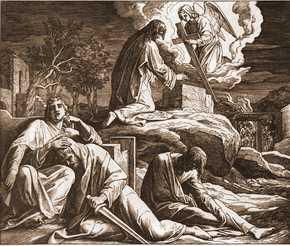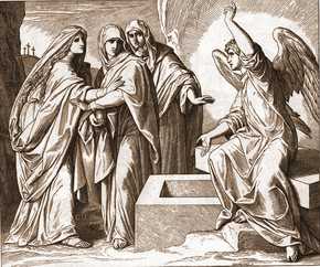 А Мария стояла у гроба и плакала. И, когда плакала, наклонилась во гроб, и видит двух Ангелов, в белом одеянии сидящих, одного у главы другого у ног, где лежало тело Иисуса. И они говорят ей: жена! что ты плачешь? Говорит им: унесли Господа моего, и не знаю, где положили Его.