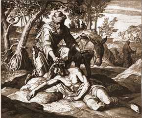 И вот, один законник встал и, искушая Его, сказал: Учитель! что мне делать, чтобы наследовать жизнь вечную? Он же сказал ему: в законе что написано? как читаешь? Он сказал в ответ: возлюби Господа Бога твоего всем сердцем твоим, и всею душою твоею, и всею крепостию твоею, и всем разумением твоим, и ближнего твоего, как самого себя, Иисус сказал ему: правильно ты отвечал; так поступай, и будешь жить. Но он, желая оправдать себя, сказал Иисусу: а кто мой ближний? На это сказал Иисус: некоторый человек шёл из Иерусалима в Иерихон и попался разбойникам, которые сняли с него одежду, изранили его и ушли, оставив его едва живым. По случаю один священник шёл тою дорогою и, увидев его, прошёл мимо. Также и левит, быв на том месте, подошёл, посмотрел и прошёл мимо. Самарянин же некто, проезжая, нашёл на него и, увидев его, сжалился и, подойдя, перевязал ему раны, возливая масло и вино; и, посадив его на своего осла, привёз его в гостиницу и позаботился о нём; а на другой день, отъезжая, вынул два динария, дал содержателю гостиницы и сказал ему: позаботься о нём; и если издержишь что более, я, когда возвращусь, отдам тебе. Кто из этих троих, думаешь ты, был ближний попавшемуся разбойникам? Он сказал: оказавший ему милость. Тогда Иисус сказал ему: иди, и ты поступай так же.