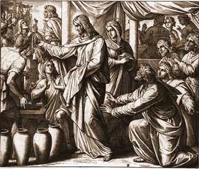 На третий день был брак в Кане Галилейской, и Матерь Иисуса была там. Был также зван Иисус и ученики Его на брак. И как недоставало вина, то Матерь Иисуса говорит Ему: вина нет у них. Иисус говорит Ей: что Мне и Тебе, Жено? ещё не пришёл час Мой. Матерь Его сказала служителям: что скажет Он вам, то сделайте. Было же тут шесть каменных водоносов, стоявших по обычаю очищения Иудейского, вмещавших по две или по три меры. Иисус говорит им: наполните сосуды водою. И наполнили их до верха. И говорит им; теперь почерпните и несите к распорядителю пира. И понесли. Когда же распорядитель отведал воды, сделавшейся вином, – а он не знал, откуда это вино, знали только служители, почерпавшие воду, – тогда распорядитель зовёт жениха и говорит ему: всякий человек подаёт сперва хорошее вино, а когда напьются, тогда худшее; а ты хорошее вино сберёг доселе. Так положил Иисус начало чудесам в Кане Галилейской и явил славу Свою; и уверовали в Него ученики Его.