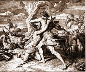 И был Авель пастырь овец, а Каин был земледелец. Спустя несколько времени, Каин принес от плодов земли дар Господу. И Авель также принёс от первородных стада своего и от тука их. И призрел Господь на Авеля и на дар его, а на Каина и на дар его не призрел. Каин сильно огорчился, и поникло лицо его. И сказал Господь [Бог] Каину: почему ты огорчился? и отчего поникло лицо твое? Если делаешь доброе, то не поднимаешь ли лица? а если не делаешь доброго, то у дверей грех лежит; он влечёт тебя к себе, но ты господствуй над ним.