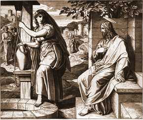 Итак приходит Он в город Самарийский, называемый Сихарь, близ участка земли, данного Иаковом сыну своему Иосифу. Там был колодезь Иаковлев. Иисус, утрудившись от пути, сел у колодезя. Было около шестого часа. Приходит женщина из Самарии почерпнуть воды. Иисус говорит ей: дай Мне пить. Ибо ученики Его отлучились в город купить пищи. Женщина Самарянская говорит Ему: как ты, будучи Иудей, просишь пить у меня, самарянки? ибо иудеи с самарянами не сообщаются. Иисус сказал ей в ответ: если бы ты знала дар Божий и Кто говорит тебе: дай Мне пить, то ты сама просила бы у Него, и Он дал бы тебе воду живую. Женщина говорит Ему: господин! тебе и почерпнуть нечем, а колодезь глубок; откуда же у тебя вода живая? Неужели ты больше отца нашего Иакова, который дал нам этот колодезь и сам из него пил, и дети его, и скот его? Иисус сказал ей в ответ: всякий, пьющий воду сию, возжаждет опять, а кто будет пить воду, которую Я дам ему, тот не будет жаждать вовек; но вода, которую Я дам ему, сделается в нём источником воды, текущей в жизнь вечную.