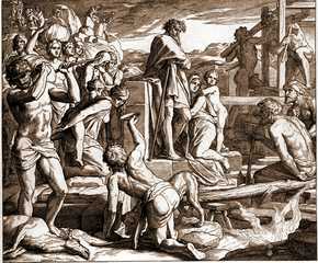 Был глагол Божий к Иоанну, сыну Захарии, в пустыне. И он проходил по всей окрестной стране Иорданской, проповедуя крещение покаяния для прощения грехов, как написано в книге слов пророка Исаии, который говорит: глас вопиющего в пустыне: приготовьте путь Господу, прямыми сделайте стези Ему; всякий дол да наполнится, и всякая гора и холм да понизятся, кривизны выпрямятся и неровные пути сделаются гладкими; и узрит всякая плоть спасение Божие. Иоанн приходившему креститься от него народу говорил: порождения ехиднины! кто внушил вам бежать от будущего гнева? Сотворите же достойные плоды покаяния и не думайте говорить в себе: отец у нас Авраам, ибо говорю вам. что Бог может из камней сих воздвигнуть детей Аврааму. Уже и секира при корне дерев лежит: всякое дерево, не приносящее доброго плода, срубают и бросают в огонь. И спрашивал его народ: что же нам делать? Он сказал им в ответ: у кого две одежды, тот дай неимущему, и у кого есть пища, делай то же. Пришли и мытари креститься и сказали ему: учитель! что нам делать? Он отвечал им: ничего не требуйте более определённого вам. Спрашивали его также и воины: а нам что делать? И сказал им: никого не обижайте, не клевещите, и довольствуйтесь своим жалованьем. Многое и другое благовествовал он народу, поучая его.